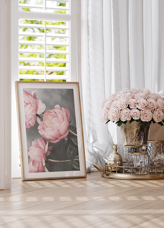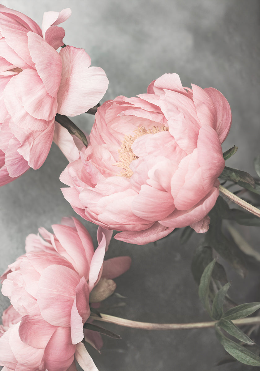 Tämä tyylikäs kukkavalokuva vangitsee pehmeän vaaleanpunaisia pioneja täydessä kukassa, ja herkät terälehdet avautuvat siroin yksityiskohdin. Mykistetty tausta korostaa romanttisia pastellivärejä ja luo ajattoman kasvitieteellisen taideteoksen, joka huokuu kauneutta, raikkautta ja luonnollista hienostuneisuutta.