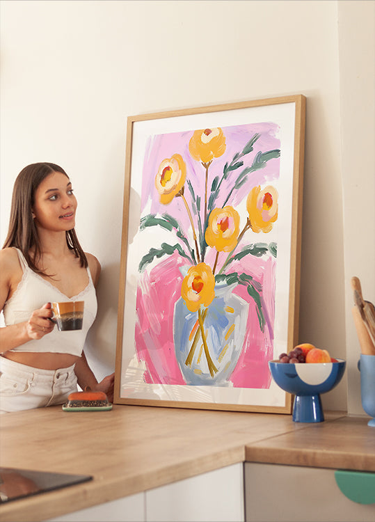 Tyylikäs kasvitieteellinen asetelma, tämä teos kokoaa herkät kukat ja lehdet varret hiljaiseksi runolliseksi asetelmaksi. Ilmeiset, maalaukselliset vedot ja hienovaraiset luonnosviivat antavat kukille liikettä ja syvyyttä tasapainottaen rauhallisen negatiivisen tilan intiimien yksityiskohtien kanssa. Luonut taiteilija Ohkimiko. Hienostunut keskipiste rauhallisiin sisätiloihin.