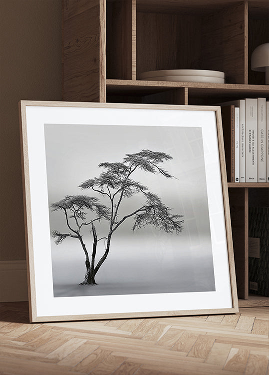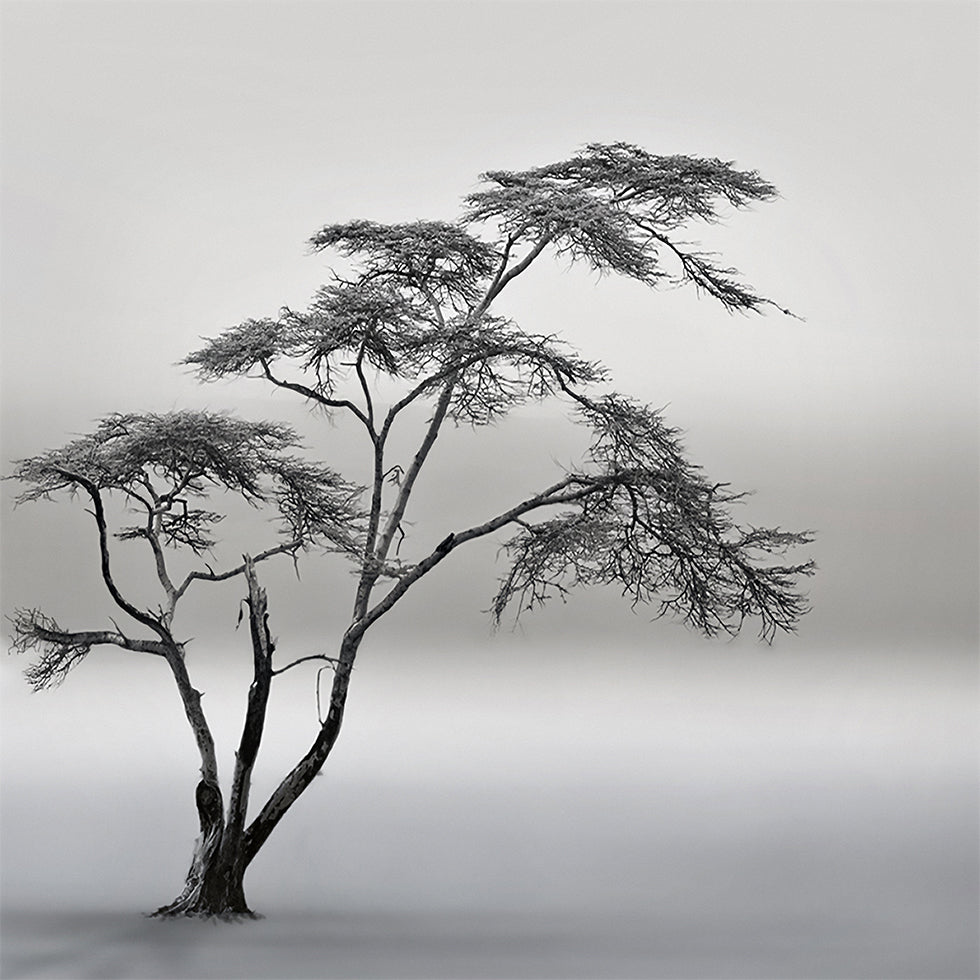 Yksinäinen puu seisoo kuvastuneena tiheässä sumussa savannin yläpuolella Naivashassa Keniassa. Yksivärinen tunnelma vangitsee hiljaisuuden, syvyyden ja avoimen maiseman, jossa aika ja etäisyys sulautuvat yhteen. Valokuva "erittäin pitkä tarina" on Piet Flourin luoma, ja se huokuu rauhallisuutta, runoutta ja pohdintaa. Kuva kaipauksesta, avaruudesta ja äärettömästä horisontista.