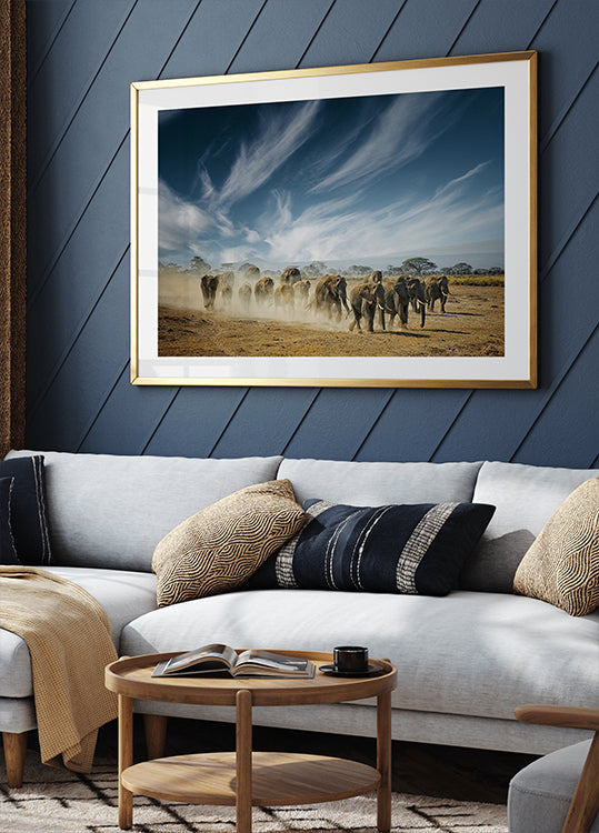 Tämä voimakas villieläinvalokuva vangitsee majesteettisen elefanttilauman, joka ryntää pölyisen savannilla laajan taivaan alla. Raakaa voimaa, yhtenäisyyttä ja Afrikan villiä henkeä huokuvasta kohtauksesta tulee upea taideteos, joka juhlii luontoa, vapautta ja erämaan loistoa.
