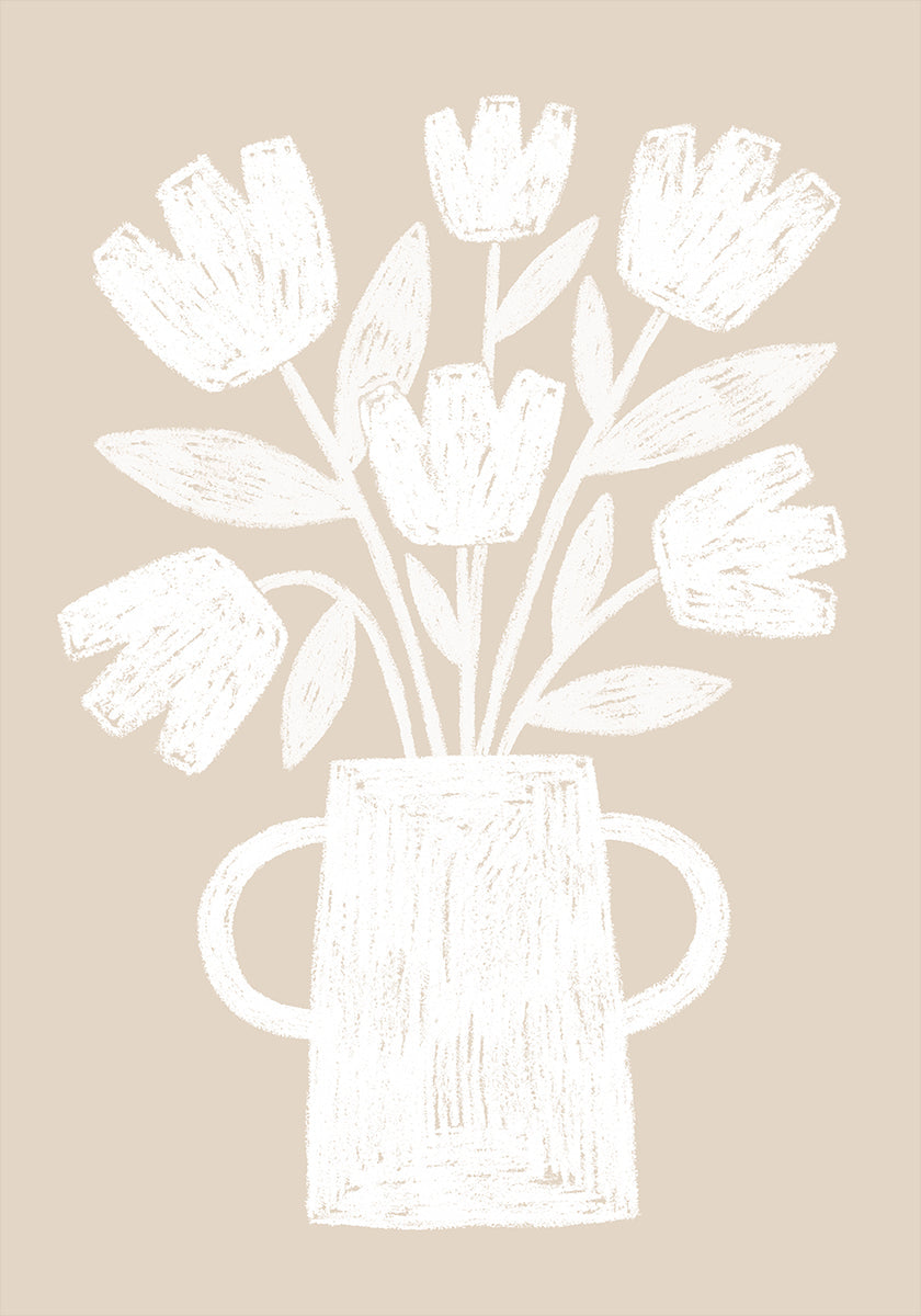 Valkoinen ruoka: Motiivi on painettu valkoisella, mattareunuksella kuvion ympärillä. Tämä antaa puhtaan ja tyylikkään ilmeen, joka korostaa aihetta ja antaa galleriahenkisen ilmeen.