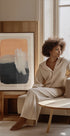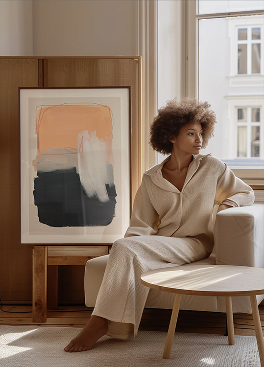 Moderni abstrakti juliste rohkeilla siveltimen vedoilla lämpimässä persikkavärissä, kerroksittain harmaassa, syvämustassa ja ripaus pehmeää valkoista. Teksturoidut vedot ja kontrastiväriset sävyt luovat vaikuttavan koostumuksen, joka tasapainottaa lämpöä ja syvyyttä – täydellinen minimalistiseen sisustukseen, skandinaaviseen sisustukseen tai tyylikkäisiin gallerian seiniin.