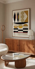 Erottuva Bauhausin inspiroima abstrakti juliste, jossa on geometrisia muotoja maanläheisissä sävyissä, kuten okra, beige ja musta, joita täydentävät punaiset ja vaaleanpunaiset aksentit. Puhtaat, jäsennellyt muodot luovat silmiinpistävän visuaalisen tasapainon, joka yhdistää modernin minimalismin vuosisadan puolivälin designiin – täydellinen nykyaikaiseen sisustukseen tai retrohenkisiin gallerian seiniin.