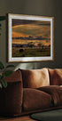 Henkeäsalpaava juliste Afrikan savannista auringonlaskun aikaan kultaisilla taivailla, hajallaan pilvillä ja akaasiapuilla, jotka kohoavat majesteettisesti sumuisten tasangoiden yllä. Elefantti laiduntaa etualalla ja vangitsee Tansanian villieläinten ja luonnon raakaa kauneutta. Täydellinen safarin ja maiseman ystäville.