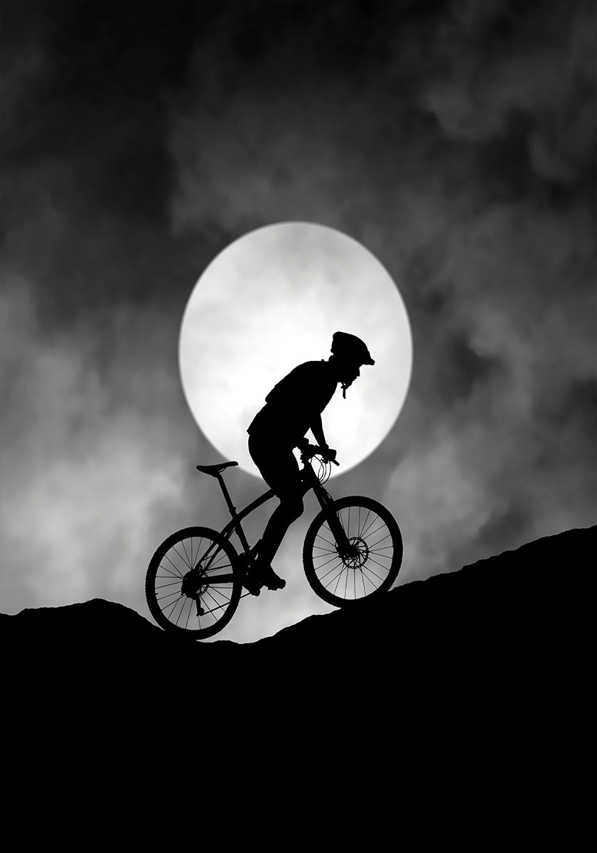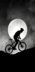 Voimakas mustavalkoinen siluettikuva pyöräilijästä, joka ajaa ylämäkeen kirkkaan täysikuun alla. Valon ja varjon dramaattinen kontrasti luo surrealistisen ja seikkailunhaluisen kohtauksen, joka vangitsee yöajelun jännityksen, päättäväisyyden ja kestävyyden luonnon taustalla.