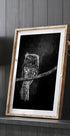 Silmiinpistävä mustavalkoinen valokuva pöllöstä kyydissä oksalla, lävistävät silmät täynnä mysteeriä. Yksiväriset sävyt korostavat jokaisen höyhenen ja varjon luoden dramaattisen hillityn muotokuvan, joka ilmentää villieläinten, yön ja luonnon villin hengen olemusta.