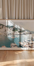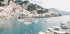 Henkeäsalpaava valokuva Amalfin rannikolta, jossa pastelliväriset talot kohoavat kallioiden yläpuolelle ja veneet kelluvat rauhallisesti turkoosissa vedessä. Kohtaus vangitsee italialaisen kesän olemuksen – harmonisen sekoituksen rannikon charmia, arkkitehtuuria ja Välimeren rauhallisuutta.
