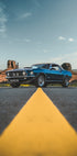 Klassinen sininen Ford Mustang pysäköity ylpeänä ikoniselle Route 66 -tielle, jota ympäröivät loputtomat aavikkotaivaat ja jyrkät kalliomuodostelmat. Tämä voimakas kuva vangitsee vapauden hengen, nostalgian ja amerikkalaisen road trip -kulttuurin – ajaton kunnianosoitus muskeliautoille, avoimille moottoriteille ja seikkailulle.