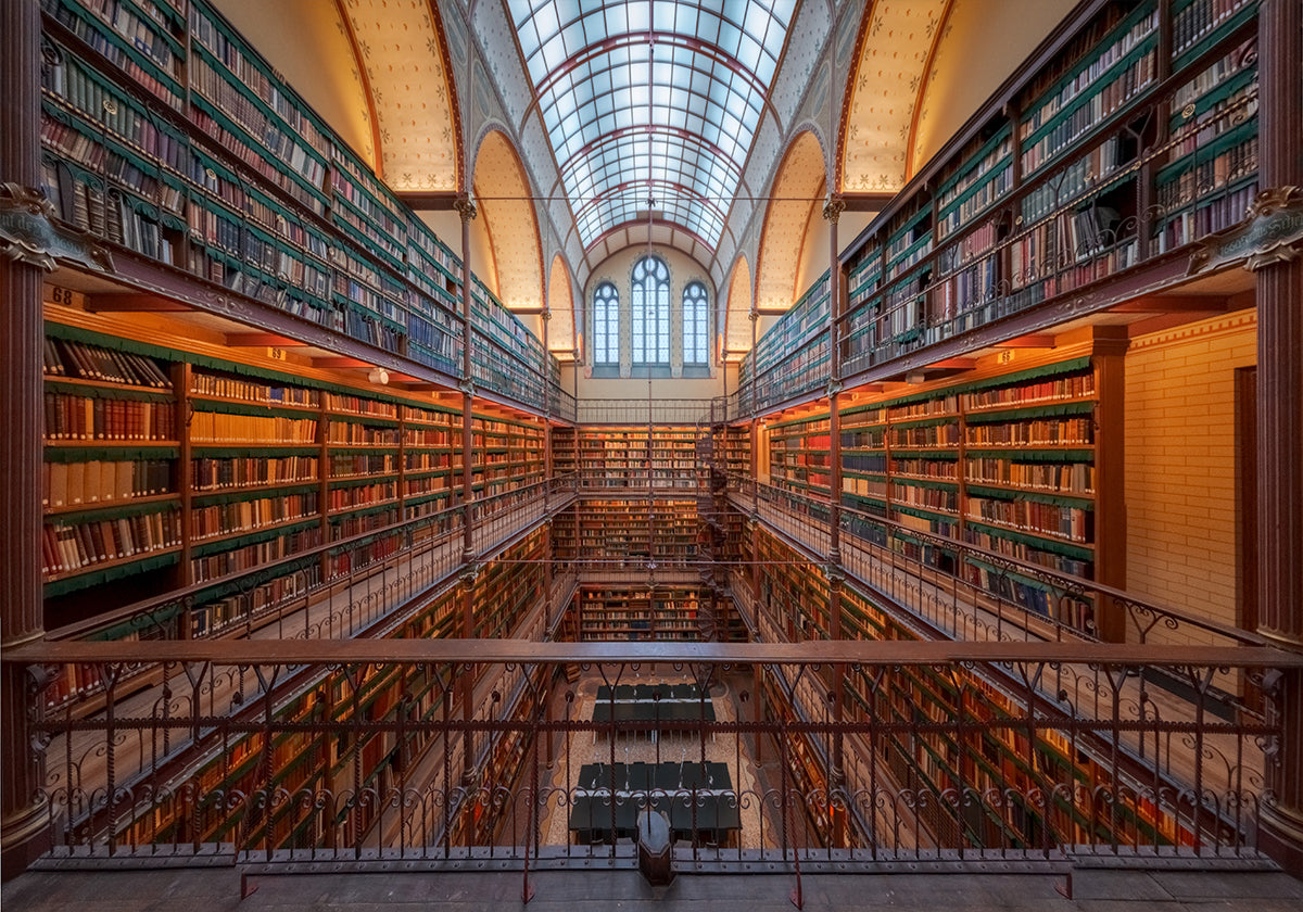 Et betagende blik ind i Amsterdams ikoniske biblioteksrum: tårnhøje bogreoler, elegante støbejernsgallerier og en snoet trappe, badet i blødt, gyldent lys. Daniel Viñe indfanger roen og storheden i byens kulturarv og inviterer dig til at gå på opdagelse mellem hylderne. Et strejf af tidløs symmetri og stille fordybelse.