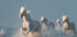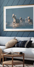 Voimakas valokuva Camarguen villeistä valkoisista hevosista, jotka on kuvattu niiden laukkaaessa aaltojen läpi. Vesipisarat kiiltävät ilmassa korostaen niiden voimaa, liikettä ja villiä henkeä. Tämä henkeäsalpaava kohtaus ilmaisee vapautta, energiaa ja luonnon ajatonta kauneutta.
