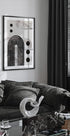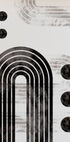 Silmiinpistävä abstrakti juliste, jossa on rohkeita mustia kaaria, pyöreitä muotoja ja kerroksittain geometrisia viivoja vaalealla teksturoidulla taustalla. Yksivärinen paletti korostaa symmetriaa ja tasapainoa tehden siitä tyylikkään ilmeen moderneihin, japanilaisiin tai skandinaavisiin sisustuksiin.
