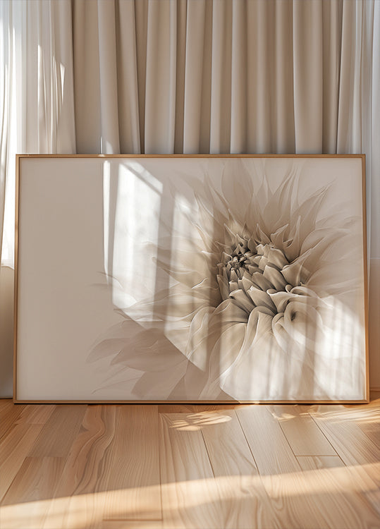 Hienostunut lähikuva daaliasta pehmeissä seepian sävyissä. Yksivärinen tyyli ja terälehtien herkät yksityiskohdat antavat kappaleelle ajattoman ja arvokkaan eleganssin, joka sopii täydellisesti rauhalliseen ja moderniin sisustukseen.