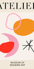 Moderni abstrakti juliste, jossa on silmiinpistäviä graafisia muotoja punaisella, vaaleanpunaisella ja oranssilla mustilla viivoilla. Tämä minimalistiseen tyyliin suunniteltu taideteos, jossa on teksti "Atelier – Museum of Modern Art", vangitsee modernin muotoilun olemuksen ja sopii täydellisesti tyylikkäisiin sisätiloihin.
