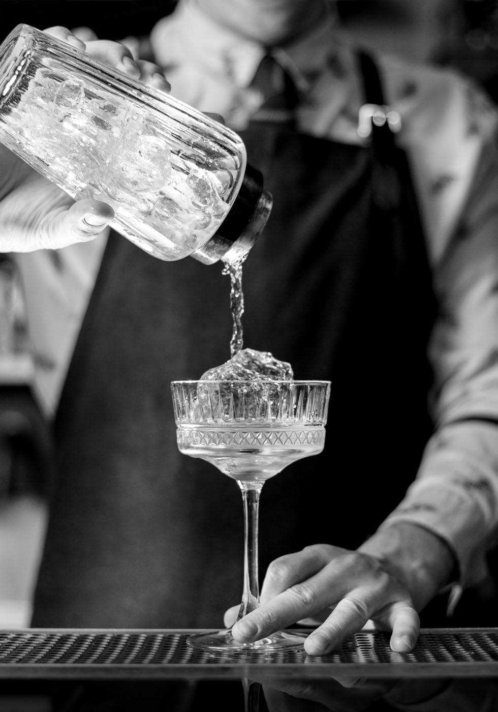 Tyylikäs mustavalkoinen valokuva, jossa baarimikko kaataa cocktailia klassiseen coupelasiin. Jää kimaltelee nesteen virratessa luoden ajattoman mixologian kohtauksen. Täydellinen baarin sisustamiseen, cocktailin ystäville tai niille, jotka arvostavat baarimikon taitoa.