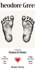 Ajaton ja tyylikäs henkilökohtainen juliste, jossa on vauvan jalanjäljet ja mukautetut syntymätiedot, kuten nimi, päivämäärä, aika, paino, pituus ja syntymäpaikka. Puhdas minimalistinen muotoilu pehmeällä neutraalilla taustalla tekee siitä täydellisen muiston uusille vanhemmille ja kauniin lisäyksen lastenhuoneeseen tai perheen seinään.
