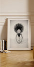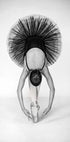 Näyttävä mustavalkoinen valokuva balerinasta sirossa venyttelyasennossa. Ylhäältä kaapattu tanssija tasapainoilee varpaiden päällä kädet tyylikkäästi ojennettuna lattiaa kohti, kun taas tutu muodostaa täydellisen pyöreän kehyksen. Taideteos juhlii klassisen baletin kurinalaisuutta, eleganssia ja tasapainoa.