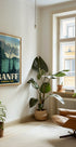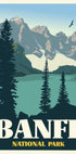 Ajaton matka-aihe Banffin kansallispuistosta: turkoosi, peilimäinen vuoristovesi, jota kehystävät tummanvihreät mäntyjä, ja horisontissa kohoavat lumihuippuiset huiput. Kirkas talviilma, hiljainen lumi ja terävät heijastukset vaativat seikkailua. Tyylikäs typografia täydentää ikonisen tunnelman. Yksinäinen lintu leijuu järven yllä.