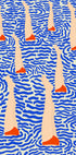 Rohkea ja leikkisä kuva synkronoiduista uimareista ylösalaisin jalat ojennettuna kuvioidusta sinisestä vedestä. Eloisat punaiset uimapuvut eroavat rytmistä aaltomaista värettä luoden eloisan abstraktin sommitelman, jossa yhdistyvät urheilu, huumori ja moderni muotoilu.