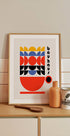 Värikäs Bauhausin inspiroima juliste, jonka geometriset muodot on järjestetty kahvikupin tavoin. Rohkeilla punaisilla, keltaisilla, sinisillä ja mustilla elementeillä tämä retromuotoilu tuo nostalgista 70-luvun kosketusta moderniin sisustukseen. Täydellinen keittiöön, kahviloihin tai kaikille, jotka rakastavat vintage-designia Bauhaus-tyylillä.