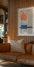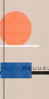 Minimalistinen Bauhausin inspiroima juliste, jossa on rohkeita geometrisia muotoja, kuten suuri oranssi ympyrä ja rohkea sininen suorakulmio beigellä taustalla. Suorat linjat ja yksinkertaiset kontrastit tekevät tästä taideteoksesta ajattoman elementin sekä modernissa että vintage-sisustuksessa.