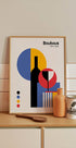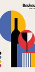 Moderni Bauhausin inspiroima juliste, jossa on viinipullo ja viinilasi, joka on tyylitelty rohkeilla geometrisillä muodoilla mustana, punaisena, keltaisena ja sinisenä. Tämä abstrakti muotoilu yhdistää viinin eleganssin ajattomaan Bauhaus-estetiikkaan, joka sopii täydellisesti baareihin, keittiöihin, ruokasaleihin ja viinin ystäville.