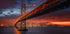 Henkeäsalpaava yönäkymä San Franciscon Bay Bridgelle valaistu lämpimin kultaisin sävyin hehkuvaa kaupungin horisonttia vasten. Dramaattinen taivas hämärässä ja heijastukset vedessä luovat vaikuttavan kaupunkikuvan, joka sopii täydellisesti kaupungin ystäville, matkailijoille ja moderniin sisustukseen.