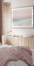 Rauhallinen rannikkovalokuva, joka tallentaa turkooseja aaltoja, jotka heiluvat kevyesti hiekkarannalla sumean pastellin taivaan alla. Kaukaiset vuoret luovat unenomaisen horisontin, joka herättää rauhaa ja lomatunnelmaa.