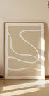 Rauhoittava, minimalistinen juliste virtaavilla valkoisilla viivoilla beigellä taustalla. Abstrakti sommitelma säteilee yksinkertaisuutta, harmoniaa ja eleganssia tehden siitä ajattoman kappaleen moderniin sisustukseen.