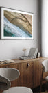 Henkeäsalpaava drone-kuva Kalifornian rannikolta Big Surissa. Pursuavat aallot kohtaavat hiekkaisen rannikon viehättävässä, abstraktissa koostumuksessa luonnon tekstuurista. Täydellinen tuomaan rannikon kauneutta ja rauhaa kotiisi.