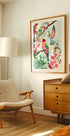 Eloisa ja trooppinen kuva värikkäistä linnuista, jotka istuvat ja lentävät rehevien oksien ja kukkien keskellä. Voimakkailla vihreän, punaisen ja sinisen sävyillä taideteos vangitsee kesän villieläinten ilon ja elinvoimaisuuden. Täydellinen tuoreen ja eksoottisen ilmeen lisäämiseen mihin tahansa huoneeseen.