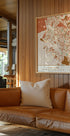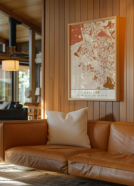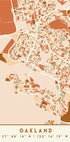 An elegant cartographic study of Oakland, this print by Emiliano Deificus renders the city's streets and shoreline in earthy gradients against deep black. Geometric blocks, subtle textures, and latitude-longitude cues create a calm, modern cityscape—perfect for urban minimalists and Bay Area hearts.