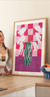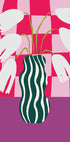 Rohkea ja leikkisä kukka-asetelma retromodernilla otteella. Raidallinen maljakko ja abstraktit valkoiset kukat seisovat eloisaa vaaleanpunaista ruudullista taustaa vasten tarjoten iloisen sekoituksen värejä, huumoria ja graafista suunnittelua.