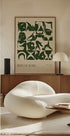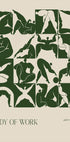 Arty Guavan (2024) näyttävä kuviollinen juliste, jossa on rohkeita abstrakteja vartalon muotoja syvän vihreänä beigellä taustalla. Teos tutkii muotoa, liikettä ja ihmisen ilmaisua modernilla graafisella tyylillä.