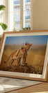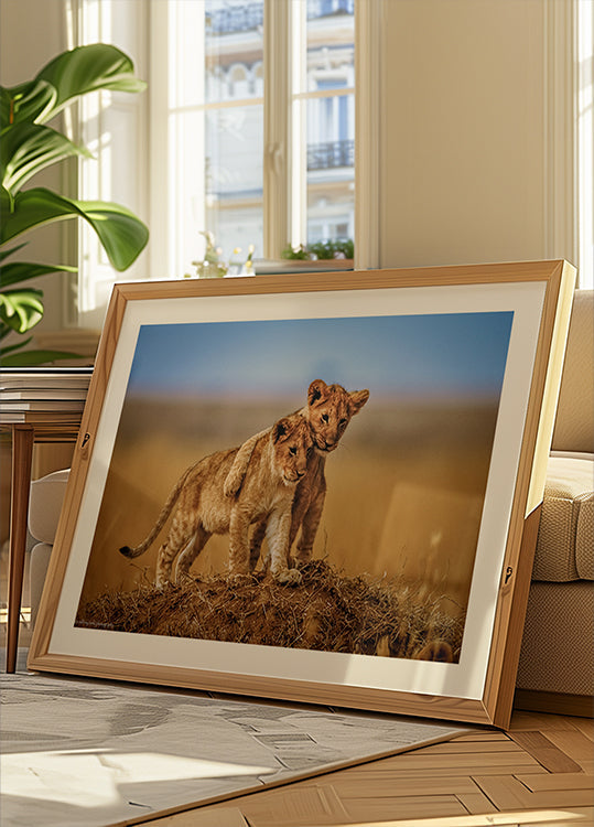 Sydäntälämmittävä luontokuva kahdesta leijonanpennusta syleilemässä toisiaan Afrikan savannilla. Heidän hellä yhteys ja leikkisä side on kauniisti vangittu ja symboloi rakkautta, ystävyyttä ja nuoruuden viattomuutta luonnon raa'assa kauneudessa.