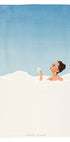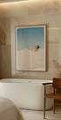 Tyylikäs kuva naisesta, joka nauttii kylpytynnyristä kirkkaan sinisen taivaan alla, kädessään lasi viiniä. Minimalistinen muotoilu ja pehmeät pastellivärit luovat rauhallisen ja ylellisen ilmapiirin, jotka sopivat täydellisesti rentoutumishuoneisiin tai tyylikkääksi koristeeksi.