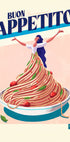 Iloinen ja leikkisä italialaisvaikutteinen juliste, jossa on silmiinpistävä lause Buon Appetito. Se näyttää naisen, jonka mekko valuu alas spagettivuorelta tomaattien ja basilikan kera, humoristisen sekoituksen ruokakulttuuria ja kuvitusta elävässä taideteoksessa.