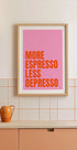 Kirkas, rohkea ja humoristinen – tässä modernissa typografisessa julisteessa on leikkisä lause "More Espresso Less Depresso" lihavoituna oranssilla tekstillä vaaleanpunaisella taustalla. Täydellinen yhdistelmä motivaatiota ja hauskanpitoa, ihanteellinen keittiöön, toimistoon tai kahvikulmiin. Täydellinen kahvin ystäville, joilla on huumorintaju.