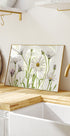 Pehmeä ja tyylikäs lähikuva kahdesta Cape koiranputkesta, joiden herkät valkoiset terälehdet taittuvat syvän sinisen ja oranssin keskellä. Tämä taideteos korostaa unenomaisesti sumealla taustalla luonnon herkkää kauneutta ja ajatonta viehätystä.