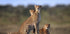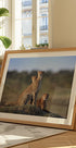 Voimakas villieläinvalokuva gepardin emosta pentuineen lepäämässä harjanteella, kun he tiedustelevat savannia. Kuva vangitsee Afrikan nopeimman saalistajan eleganssia, suojelua ja hellyyttä, ja se on kunnianosoitus luonnolle, perhesiteille ja eläinten villille hengelle.