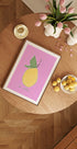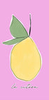 Eloisa pastelli taideteos sitruunasta vihreillä lehdillä vaaleanpunaista taustaa vasten, tekstillä "le citron". Moderni ja leikkisä keittiöjuliste, täydellinen lisäämään väriä ja raikkautta seinillesi.