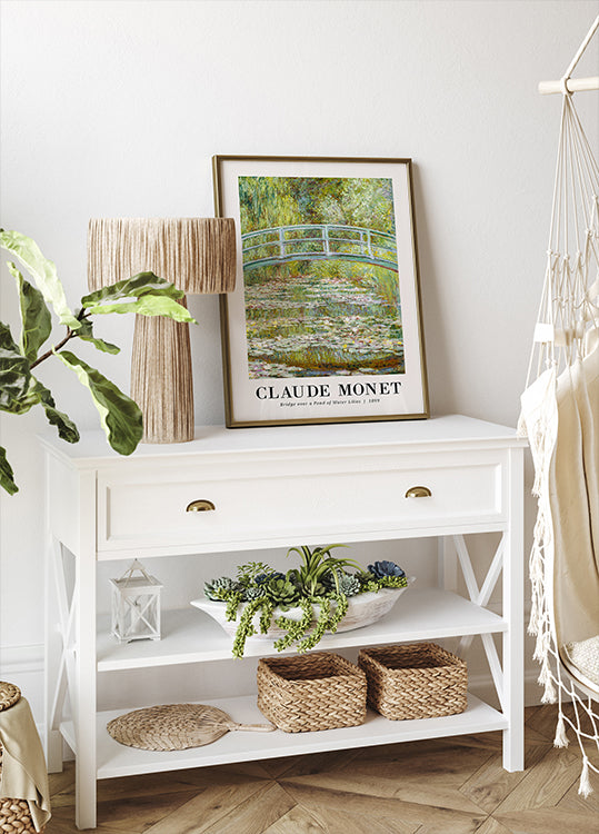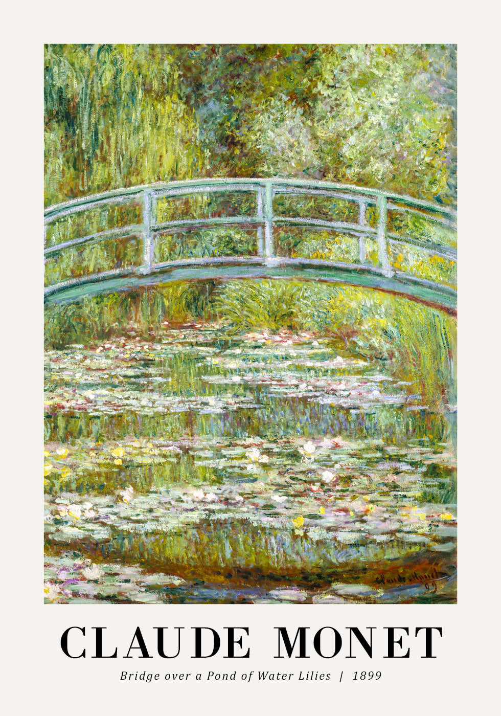Henkeäsalpaava Claude Monet'n impressionistinen mestariteos, maalattu vuonna 1899. Taideteos kuvaa Monet'n japanilaisen sillan rauhallista kauneutta hänen puutarhassaan Givernyssä, jota ympäröi vehreys ja kelluvat lumpeet. Eloisat siveltimen vedot ja pehmeä väripaletti luovat unenomaisen, rauhallisen tunnelman, joka on täydellinen luonnon ystäville ja klassisen taiteen ihailijoille.
