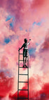 Surrealistinen ja inspiroiva taideteos, joka kuvaa lasta kiipeämässä tikkailla haaveilevaa vaaleanpunaista ja violettia taivasta vasten. Figuuri näyttää maalaavan tai kurkottavan pilviin ja symboloivan mielikuvitusta, toivoa ja luovuutta. Täydellinen motivoivaksi seinätaiteeksi tai näyttäväksi keskipisteeksi modernissa, värikkäässä kuvaseinässä.