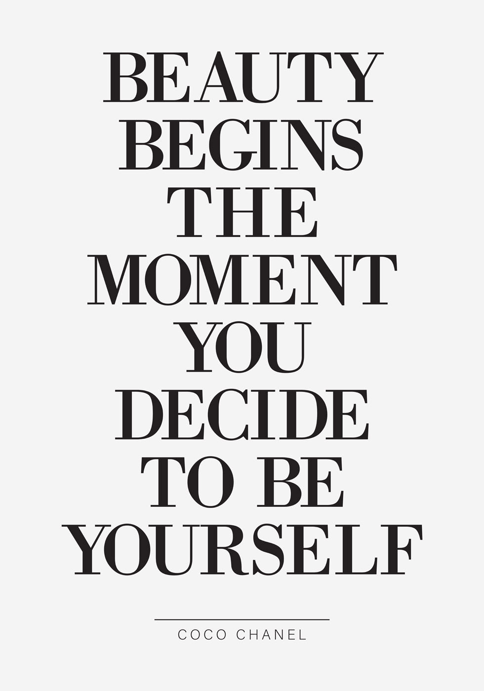Hienostunut ja minimalistinen typografinen muotoilu Coco Chanelin inspiroivalla lainauksella: "Kauneus alkaa siitä hetkestä, kun päätät olla oma itsesi." Tämä tyylikäs mustavalkoinen taideteos huokuu ajatonta tyyliä ja itsevarmuutta, ja se sopii täydellisesti muodin inspiroimaan sisustukseen, vaatekaappiin tai toimistoihin.