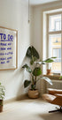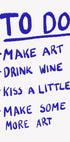 Leikkisä ja motivoiva typografia, jossa on käsin kirjoitettu "To Do" -lista: Tee taidetta, juo viiniä, suutele vähän, tee lisää taidetta. Lihavoitu sininen teksti valkoisella taustalla, tämä hauska ja moderni juliste yhdistää huumoria, romantiikkaa ja luovuutta – täydellinen pariskunnille, taiteilijoille tai kaikille, jotka rakastavat elämää intohimolla.