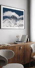 Rauhallinen talvimaisema avautuu selkein, sinervin sävyin: majesteettiset lumihuippuiset huiput kohoavat sumuisten laaksojen yläpuolelle, kun taas taivaalla ajelehtivat pehmeät pilvet. Puhdas, viileä ilmapiiri kutsuu mietiskelyyn ja rauhaan. Xiaoyang Wangin luoma runollinen katse vuorten vahvuuteen ja hiljaisuuteen. Täydellinen hiljaiseksi keskipisteeksi olohuoneessa.