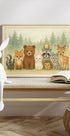 Midt i en stille skovlysning samles ræv, dådyr, hare, egern og en vis ugle blandt gran, bær og blød mos. Dæmpede jordtoner og fine teksturer skaber en rolig, eventyrlig stemning, der inviterer til fordybelse og historier ved sengetid—en varm, poetisk hyldest til skovens små venner. Farverne hviler øjet og giver rummet en blid, tryg atmosfære.