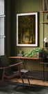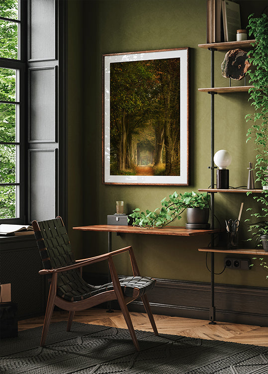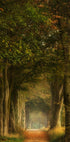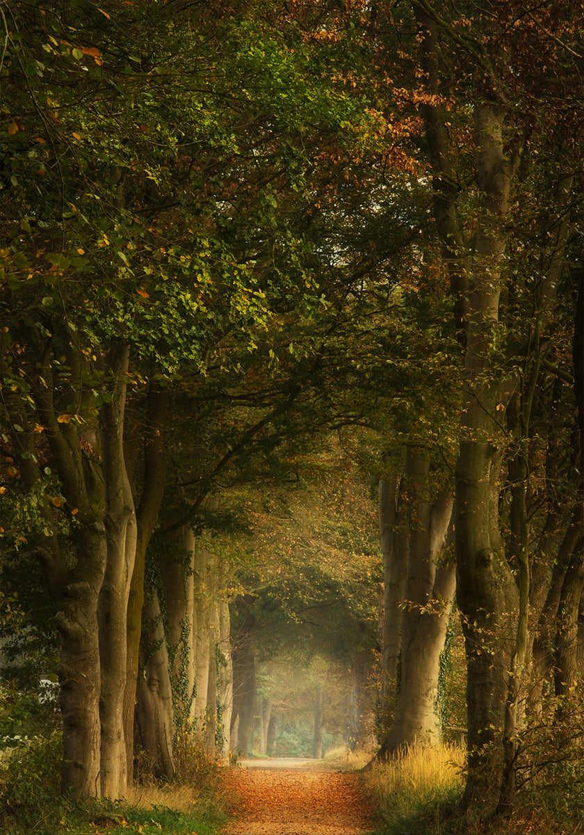 Syksyn lehtien peittämä unenomainen metsäpolku korkeiden puiden ja pehmeän kultaisen valon ympäröimänä. Tämä taideteos vangitsee luonnon hiljaisen kauneuden ja herättää rauhan tunteita, pohdintaa ja ajattomia matkoja lumoavien metsien halki.