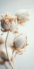 Pehmeä ja rauhallinen lähikuva kuivatuista kukista kermaisen beigen sävyissä. Tyylikkäällä minimalismillaan ja rauhallisella estetiikallaan tämä taideteos välittää hiljaisuuden ja hienostuneen kauneuden tunteen, joka on täydellinen moderniin sisustukseen.
