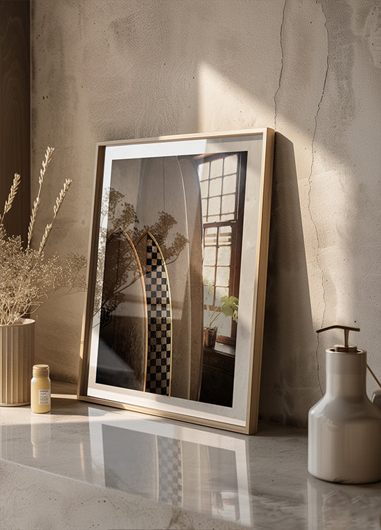 Tämä aurinkoinen ja rauhallinen rannikkoasetelma yhdistää tyylikkään beigen lainelaudan reheviin monsteranlehtiin luoden pehmeitä varjoja minimalistista seinää vasten. Suolailman kuiskaus ja viikonloppupako, se tasapainottaa urheilua ja kasvitieteellistä rauhaa – moderni oodi surffauskulttuurille, jonka on vanginnut valokuvaaja Shot by Clint. Lämpimillä, auringon suudelmilla sävyillä.