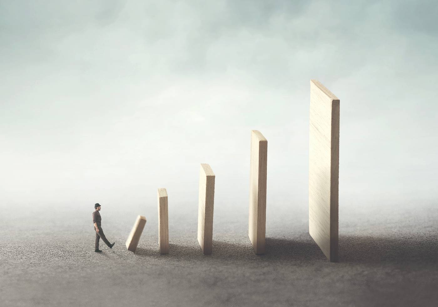 Surrealistinen visuaalinen metafora – pieni mies työntämässä ensimmäistä monista kasvavista dominopalikoista. Voimakas kuva siitä, miten pienet teot voivat johtaa suuriin seurauksiin – ihanteellinen harkittuihin tai motivoiviin tiloihin.